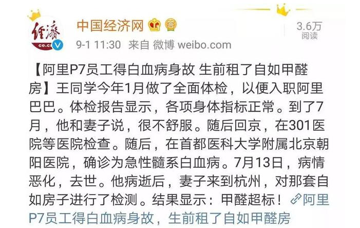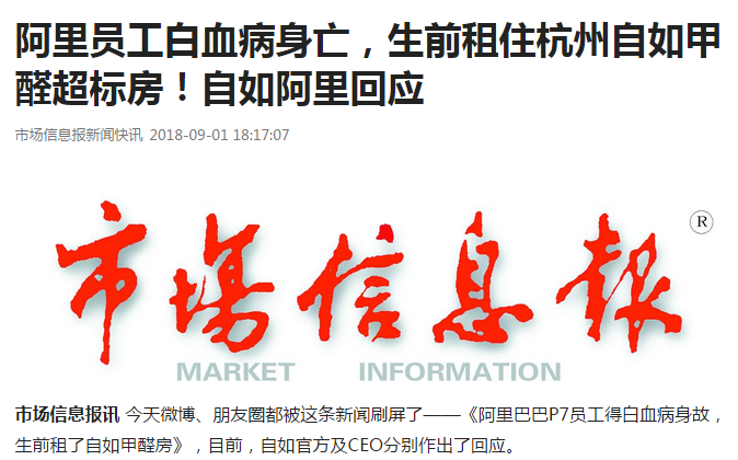 市场信息报:阿里员工白血病故 生前住自如甲醛超标