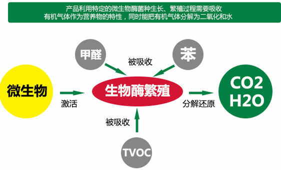 生物酶异味清除剂采用高活性天然植物精华液、特选有益微生物、生物酶和营养物质制成的复合型生物活性剂。产品具有消除异味净化室内空气(装修污染气体甲醛、苯系物及TVOC等)的效果,该产品的技术特点是基于微生 物(通常是有益菌)在好氧条件下能将有机污染物转化成水、二氧化碳和生物质。以植物特效溶解酶,加上微量氧化吸附剂、活化剂、稳定剂和聚合剂经过高温化合后,冷却加入少量结合挤制备的甲醛捕捉剂,可较好地分解室内空气中的有害物质。