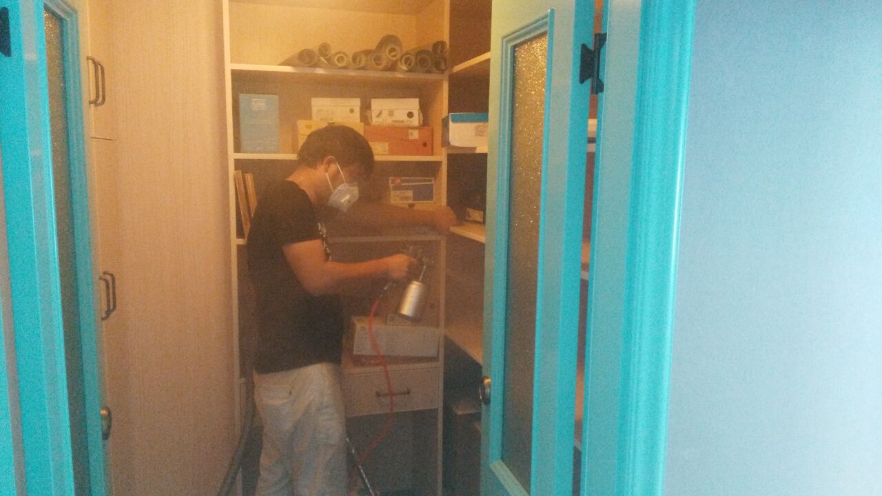 针对其结构特点及污染情况,我公司技术及施工人员采用专项专治的施工方案,针对重点污染区域,重点治理,例如鞋柜、儿童床、床垫。针对其墙面、沙发使用我公司研发的利纯光触媒进行甲醛清除,这些地方光照量较充足,便于光触媒对甲醛的分解,对于刷漆的家具、书桌、衣柜、木门等采用甲醛清除剂进行处理,针对不同污染物,做分别处理。经过我公司重点治理,一周后复查结果各种有害物质含量均已达到国家标准以内,为业主清理甲醛,还顾客一个安全,健康的生活环境是我们全体工作人员的责任,下面为施工现场照片: