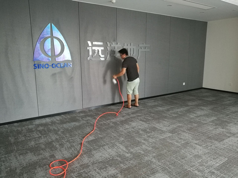 在了解到办公区域的污染源头后,我公司采取了计划施工,先是对粉刷的墙面喷涂利纯纳米光触媒,高压喷枪的优点是喷涂均匀,且覆盖率高,持续,可以喷射到死角,而光触媒是最为安全、高效、安全的除甲醛产品,在有光照的地方均能反映,且不会较少,对于数量巨大的办工家具,使用甲醛清除剂清除,甲醛清除剂除醛快速、高效、强力渗透性,将释放出来的甲醛等有害物质快速有效分解,且对于光的需求不大,适合家具除醛,而对于会议室的地毯,则采用高温熏蒸的施工方式,可以快速渗透,快速除甲醛,清理甲醛,营造安全绿色室内环境是我们全体工作人员的责任