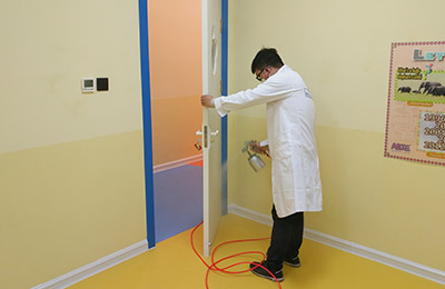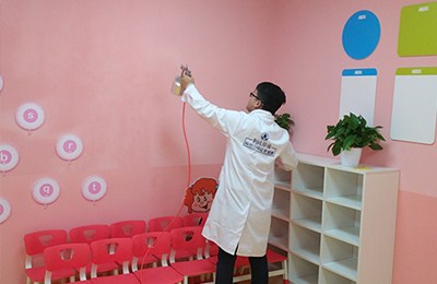 针对其空间结构特点、污染物种类、污染源头,结合我公司多年的幼儿园、早教机构的治理经验,针对易散发甲醛等有害物质的污染源,重点治理,对教师的办公室办公家具,因为板材较厚,不易渗透,我公司采用高温熏蒸技术将甲醛清除剂强力渗透进板材内部,对粉刷的墙面,使用利纯纳米光触媒,进行甲醛清除,这些地方光照量较充足,便于光触媒对甲醛的分解,对于办公家具、书桌、储物柜、木门、地板等污染重灾区,采用甲醛清除剂进行处理,且施工使用产品安全无毒,产品已通过国家权威部门安全无毒检测。在每一遍施工中,我们不放过任何一个可能释放甲醛的污染源头,施工时轻拿轻放,施工后将所有物品回归原位,良好的施工态度得到了相关负责人的肯定。