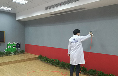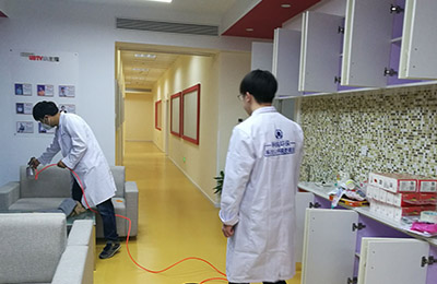 针对其空间结构特点、污染物种类、污染源头,结合我公司多年的幼儿园、早教机构的治理经验,针对易散发甲醛等有害物质的污染源,重点治理,对教师的办公室办公家具,因为板材较厚,不易渗透,我公司采用高温熏蒸技术将甲醛清除剂强力渗透进板材内部,对粉刷的墙面,使用利纯纳米光触媒,进行甲醛清除,这些地方光照量较充足,便于光触媒对甲醛的分解,对于办公家具、书桌、储物柜、木门、地板等污染重灾区,采用甲醛清除剂进行处理,且施工使用产品安全无毒,产品已通过国家权威部门安全无毒检测。在每一遍施工中,我们不放过任何一个可能释放甲醛的污染源头,施工时轻拿轻放,施工后将所有物品回归原位,良好的施工态度得到了相关负责人的肯定。